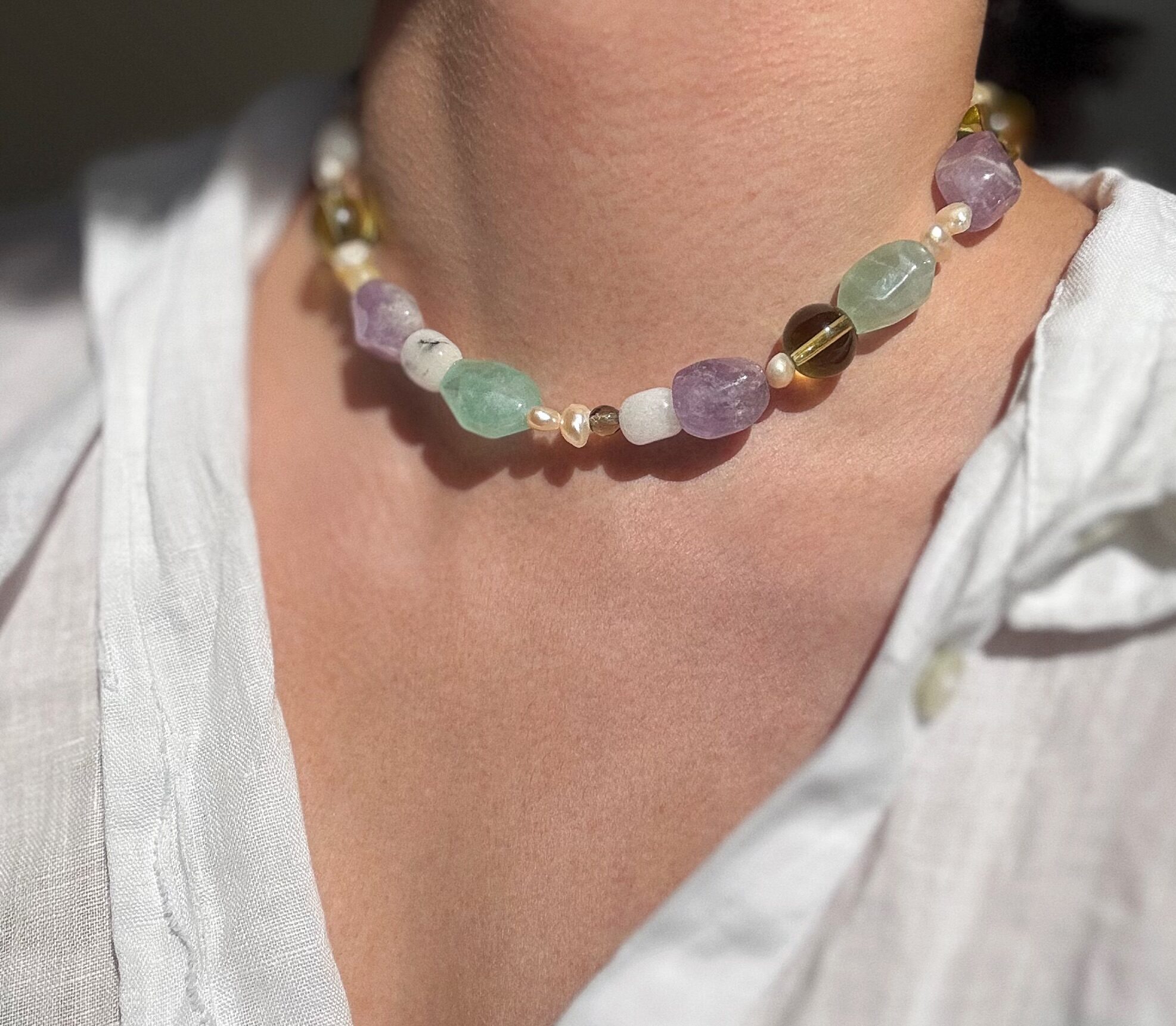 חלק מהאבנים בשרשרת : אבן חן אמטיסט , ג'ייד לבנה, ג'ייד ירוקה , קלצ'יט צהובה ..